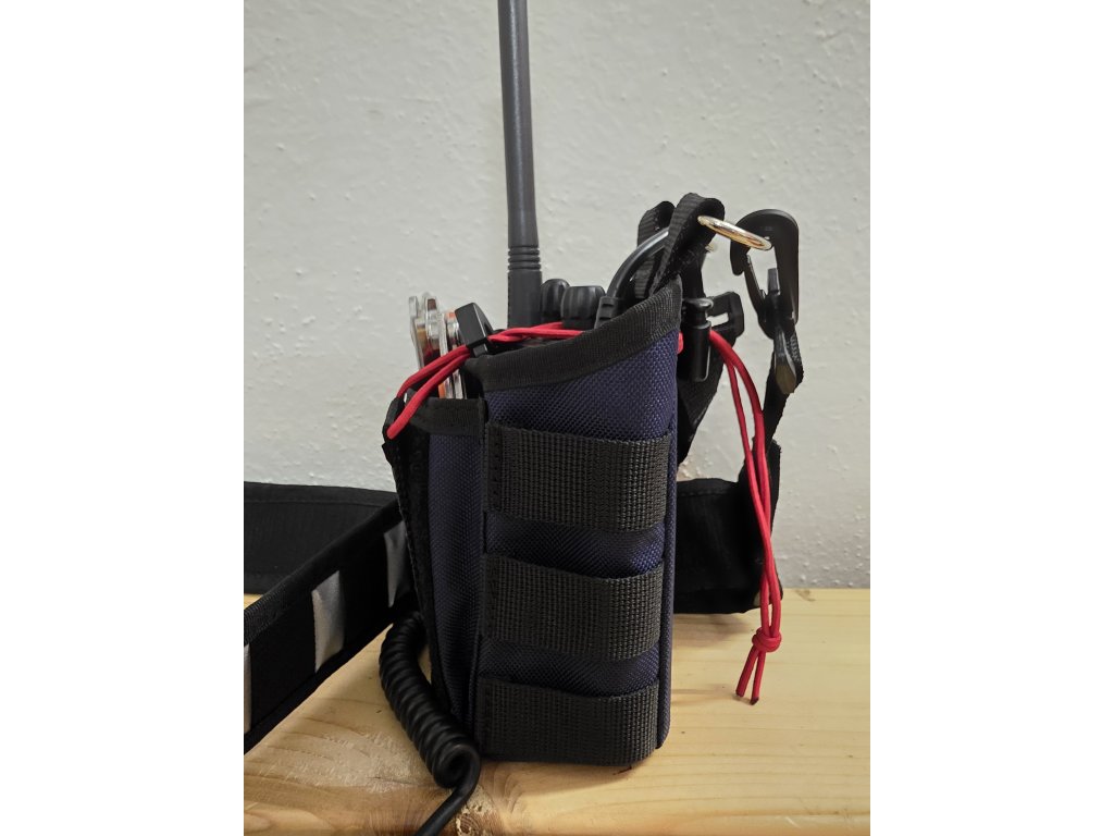 Krátký popruh slouží k fixaci k bundě nebo vestě a zabraňuje houpání kapsy s vysílačkou.