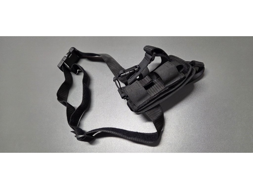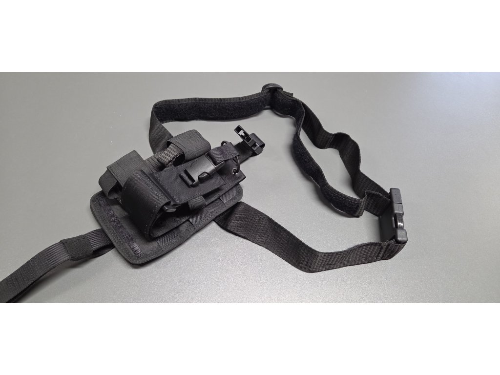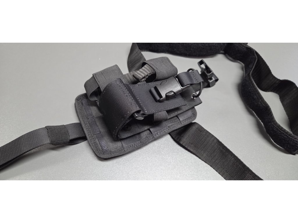Přední díl univerzální odnímatelné opaskové platformy je opatřen suchým zipem a sundavatelnou platformou s molle vazbouna které je připevněno pouzdro na turniket a vysílačku.